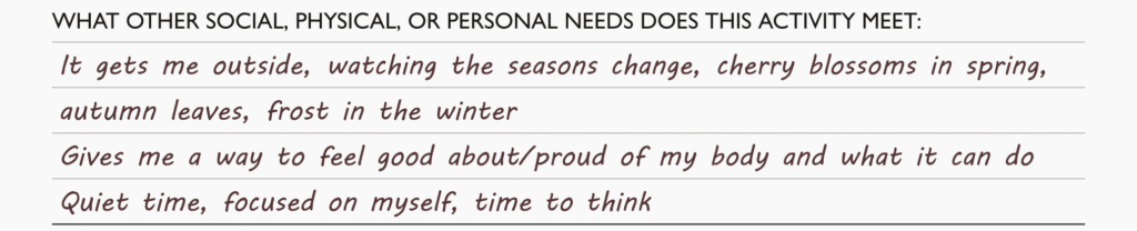 Here we want a quick summary of the things that make this activity enjoyable and fulfilling day-to-day. That will likely be a combination of enjoyable parts of the activity itself, other benefits it provides, and ways that it connects to the highlight experiences of the activity at its best.