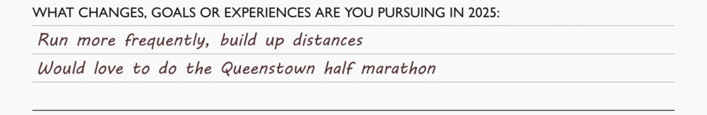 This isn’t intended to be a place for a major goalsetting exercise. Instead, we want to note anything that might influence the kind of process we try to build. If you’re thinking of doing a half marathon, you might need to increase the frequency and distance of your day-to-day runs.