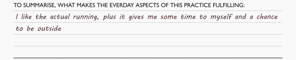 Spend some time thinking about this. For some people (like our runner) this might not be very complicated – if you like running, then going running is probably enjoyable. But for a musician who enjoys performing and the energy of the crowd, sitting in your room practicing alone might not be so appealing.